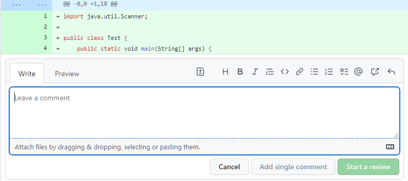 3. 리뷰 달 line이나 여러 개의 줄을 누르고 + 클릭 후 리뷰 작성