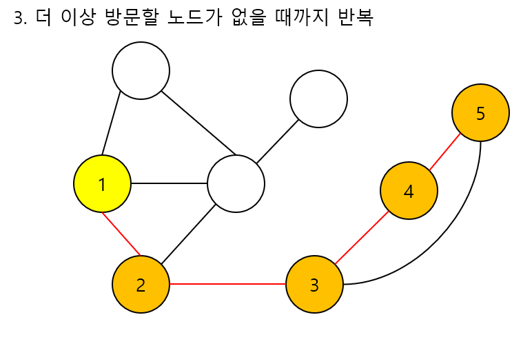 BFS와 달리 DFS는 한 노드에서 인접하고 방문하지 않은 노드가 있으면 계속해서 방문한다. 5까지 갔을 때, 5는 인접한 노드 중 방문하지 않은 노드가 없다.