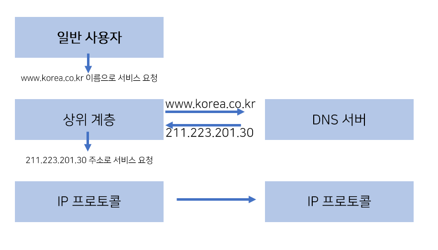 인터넷 내부의 네트워크 계층은 호스트를 IP주소로 구분 - 일반 사용자는 문자로 된 호스트 이름 사용