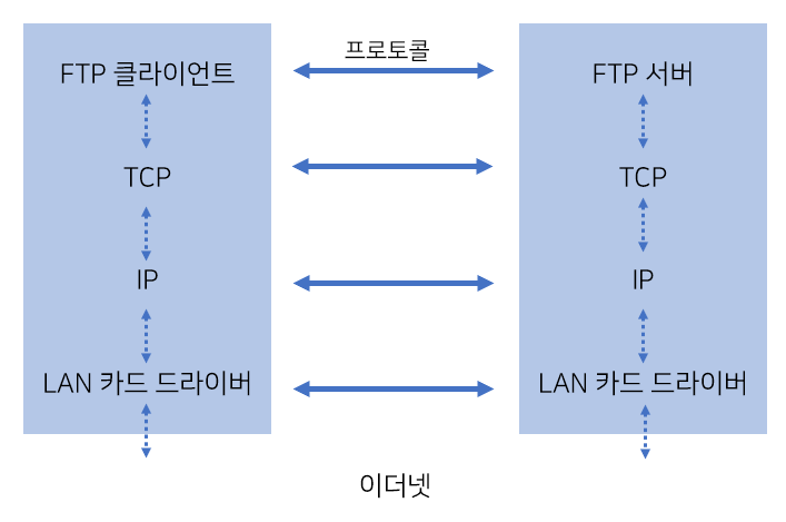 일반 사용자: 응용 계층을 통해 데이터의 송수신 요청 → 순차적으로 전달 → 물리 계층을 통해 상대 호스트에 전송