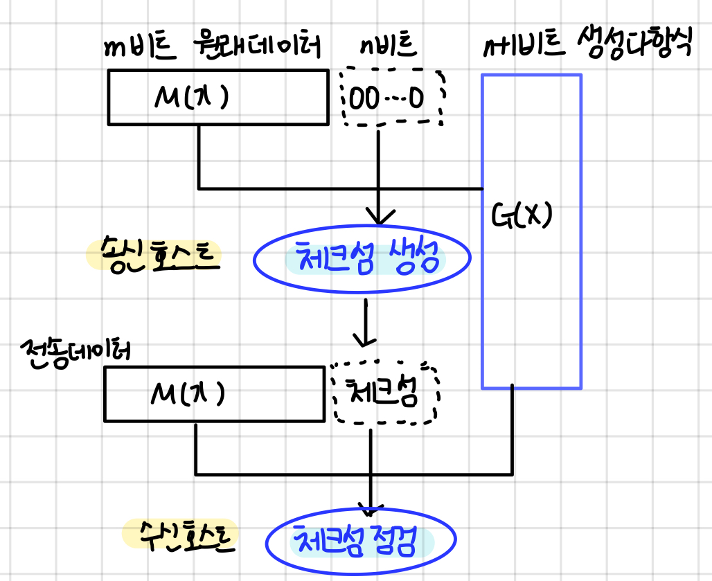데이터가 m비트의 M(x)라면 데이터 전송 과정에서 n+1비트의 생성 다항식 G(x)를 사용해 오류 검출 코드인 n비트의 체크섬을 생성하여 오류 제어 기능 수행