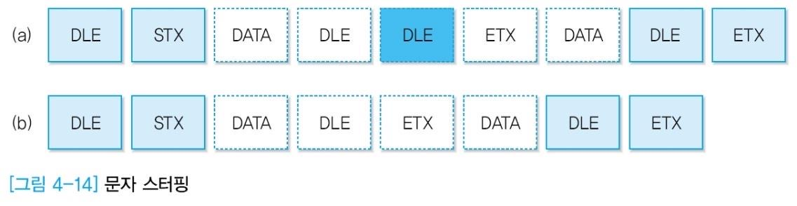 Character Stuffing: 문자 프레임 내부의 전송 데이터에 DLE 문자가 포함되면서 발생하는 혼란을 예방