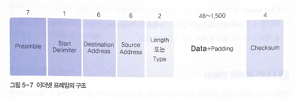 - Preamble: 7바이트, 수신 호스트가 송신 호스트의 클록과 동기를 맞출 수 있도록 시간 여유를 제공하는 것, 각 바이트는 10101010비트 패턴을 포함