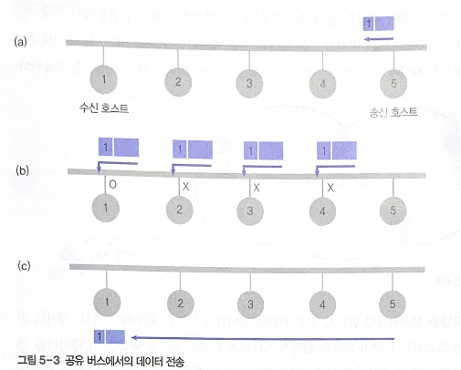 (a)에서 호스트 5가 프레임을 전송: 전송하기 전에 다른 호스트가 공유 버스를 사용하고 있는지 확인
