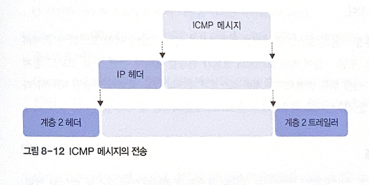 ICMP 메시지는 데이터 링크 계층에 바로 전달되지 않고, IP 패킷에 캡슐화된 후 전달