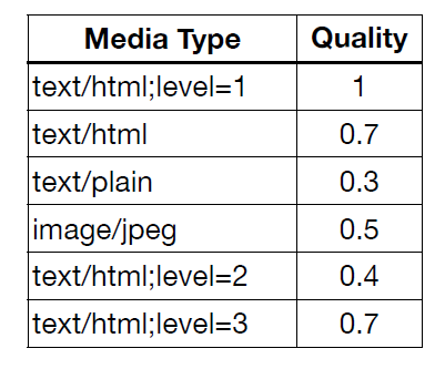 - Accept: text/_;q=0.3, text/html;q=0.7, text/html;level=1, text/html;level=2;q=0.4, _/*;q=0.5