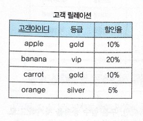 고객아이디가 apple인 고객 → 이름이 정소화, 등급이 gold인 한 사람만 있음