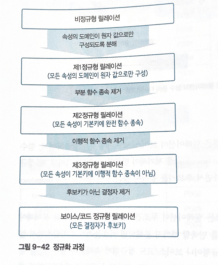 정규화: 이상현상이 발생하지 않도록 릴레이션을 관련이 있는 속성들로만 구성하기 위해 릴레이션을 분해하는 과정