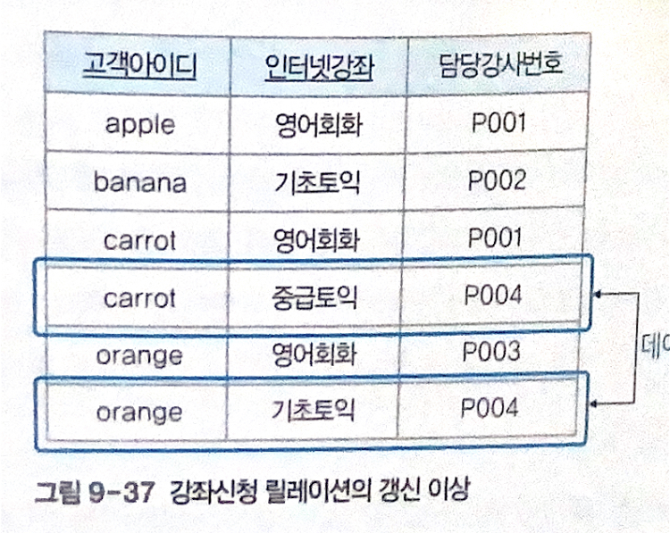 이상(anomaly) 현상: 데이터베이스를 잘못 설계해서 불필요한 데이터 중복이 발생하여 릴레이션에 대한 데이터의 삽입 수정 삭제 연산을 수행할 때 발생하는 부작용
