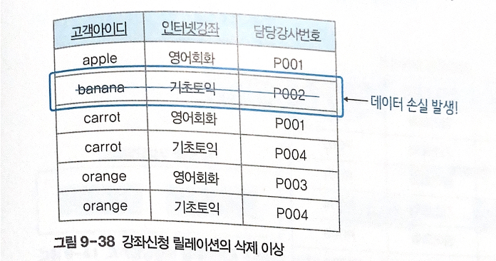 - 투플을 삭제하면 꼭 필요한 데이터까지 함께 삭제되는 데이터 손실의 문제
