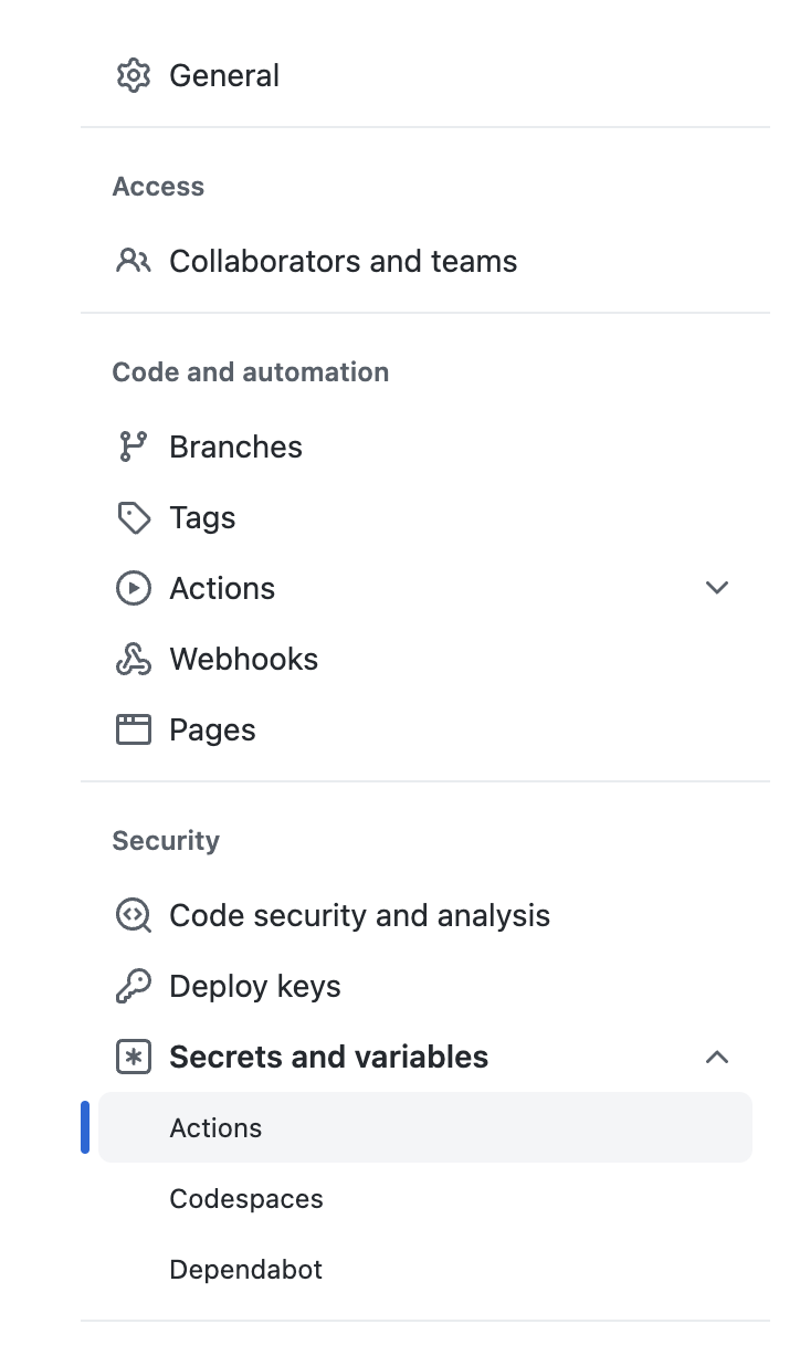 Secrets and variables -> Actions에서 secrets를 설정할 수 있다.