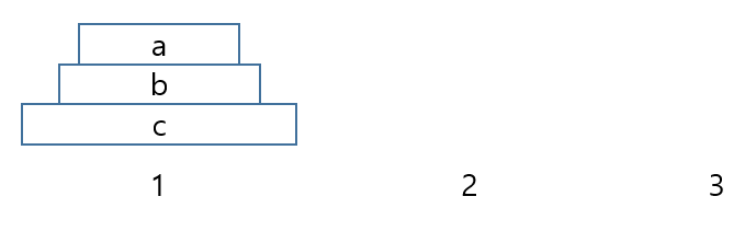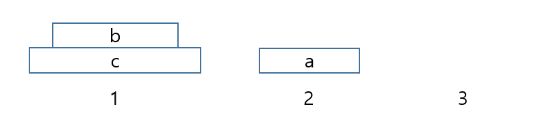 1에서 3으로 옮기는 것을 목표로 한다. 이를 위해 가장 큰 원판인 c가 먼저 3으로 가야 한다.