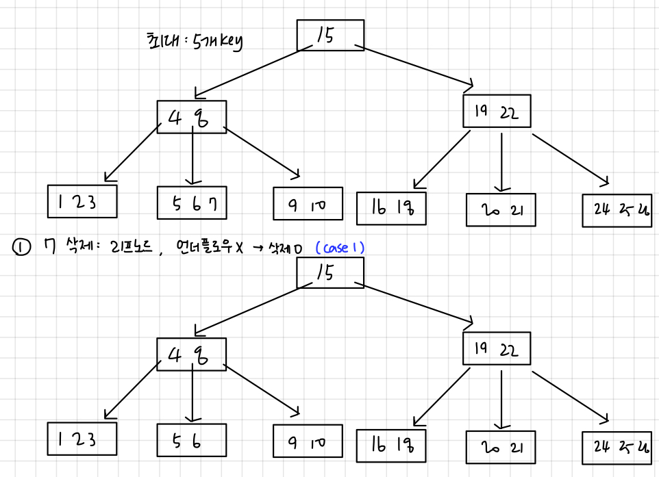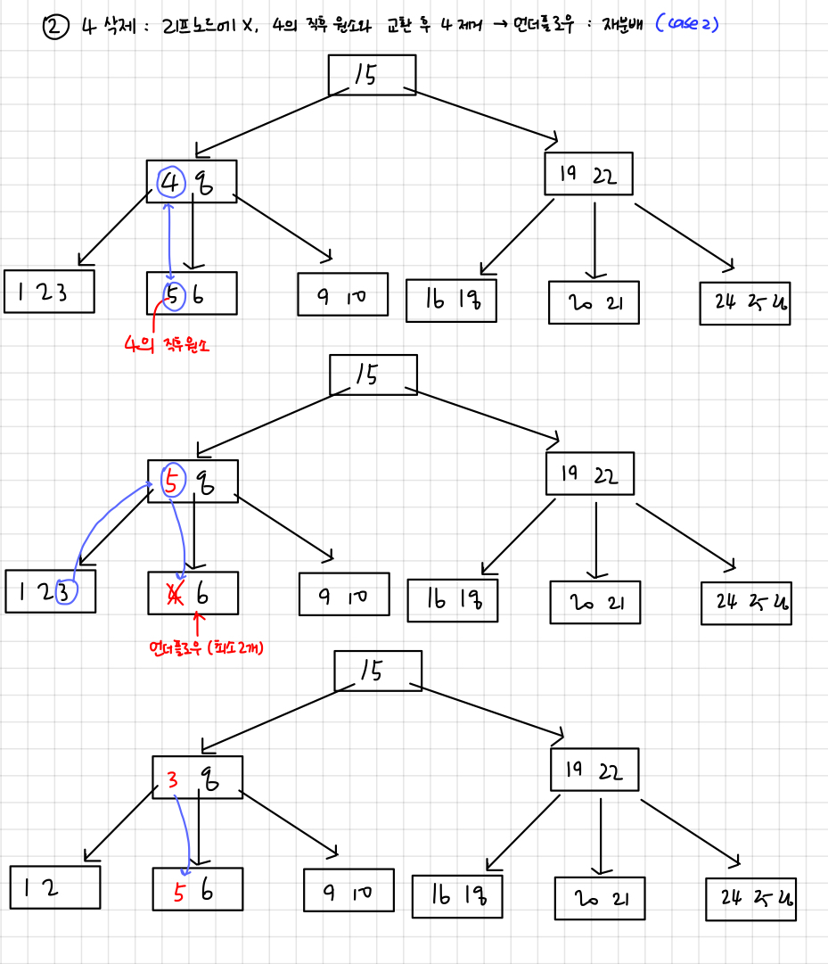 - x를 제거한 후 노드에 언더플로우가 발생하면 해소한다. (case 3)