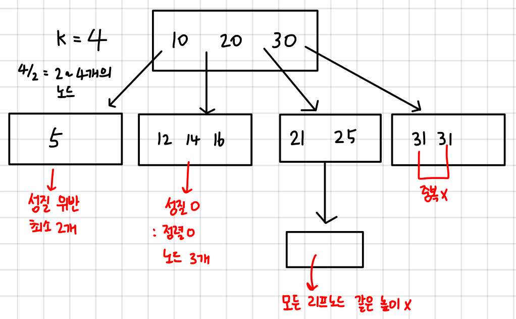 - 노드의 자료수(key)가 3개라면, 그 노드의 자식 수는 4개