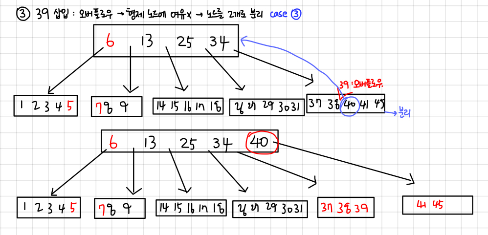 - 형제 노드에 여유가 없으면 노드를 2개로 분리한다. 분리 작업은 부모 노드로 키를 하나 넘기는 작업을 포함한다. (case 3)