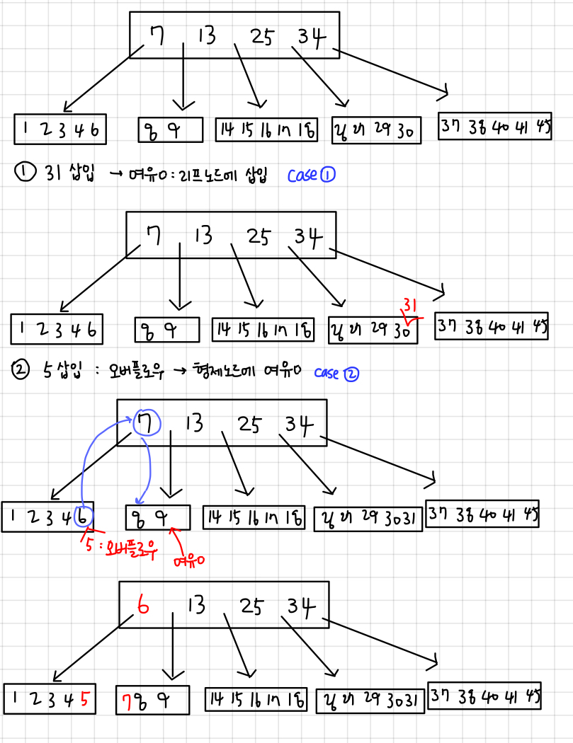 - 노드 r에 여유가 없으면 형제 노드에 공간의 여유가 있는지 살펴본다.