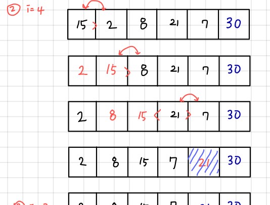 두 번째는 30을 제외하고 다섯개의 원소만 비교하며 같은 과정을 반복한다. 이 사이클이 끝나면 두 번째로 큰 원소인 21이 자신의 위치를 찾아간다.