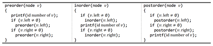 BT의 모든 노드를 순회하는 방법은 전위 순회(preorder), 중위 순회(inorder), 후위 순회(postorder)로 총 세 가지가 있다. 이 세 방법은 아래에 C 스타일의 의사 코드로 나와 있다. BT의 노드 v에 대해서, v.left는 왼쪽 자식, v.right는 오른쪽 자식을 나타낸다. v가 왼쪽 자식이 없으면 v.left는 ∅와 같고, 오른쪽 자식이 없으면 v.right는 ∅와 같다.
